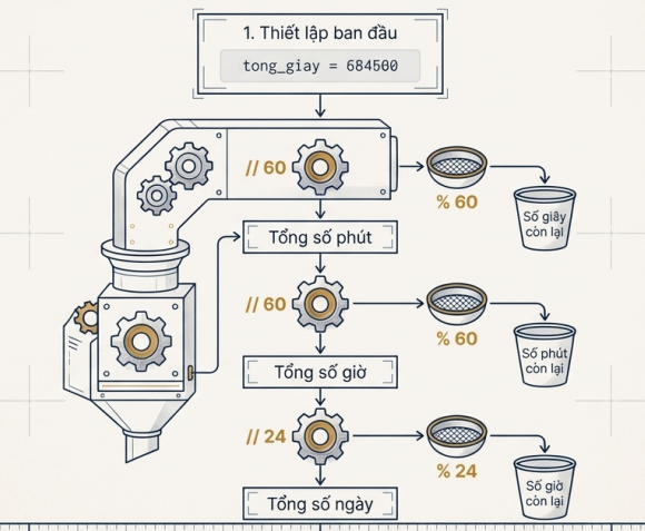 • Ví dụ Vận dụng Kinh điển: Chương trình tính toán số giây lớn (ví dụ: 684500 giây) ra đơn vị ngày, giờ, phút, giây thể hiện việc sử dụng lệnh gán và các phép toán chia nguyên (//) và chia lấy dư (%). Đây là bài toán “giải mã thời gian” mà mọi lập trình viên đều phải biết!